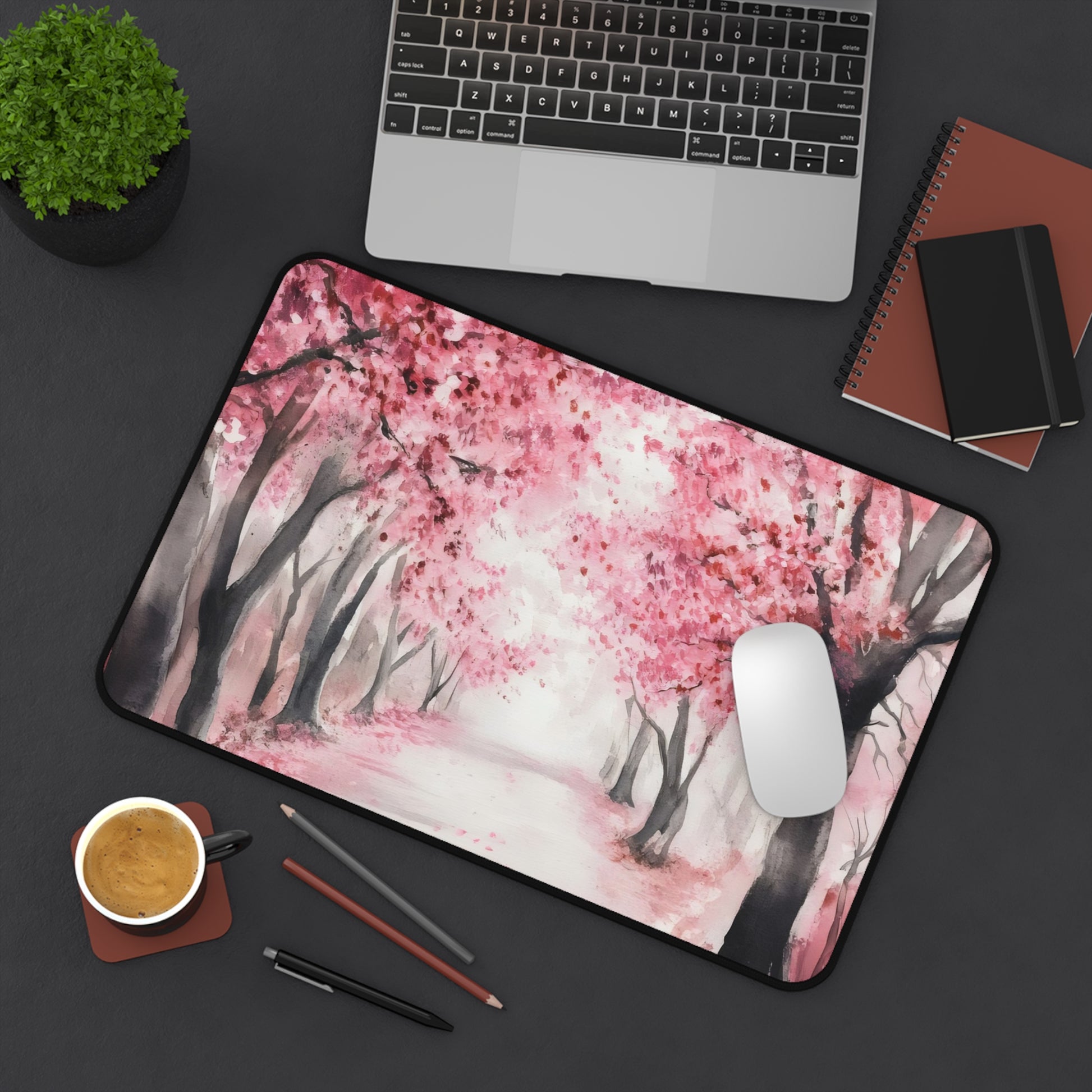 Spread of soft pink blossoms arch overhead, a quiet path painted in watercolor tones — this desk mat brings a calm, studio-like pause to your workspace. The smooth neoprene top shows every petal in vivid color while the textured, non-slip base keeps keyboards and sketchbooks steady during long work sessions. Hemmed edges protect the print and prevent fraying, so this mat stays graceful through daily use. Sized to fit a laptop, keyboard, or art setup, it’s a gentle, functional surface that turns ordinary tasks into a moment of calm reflection.