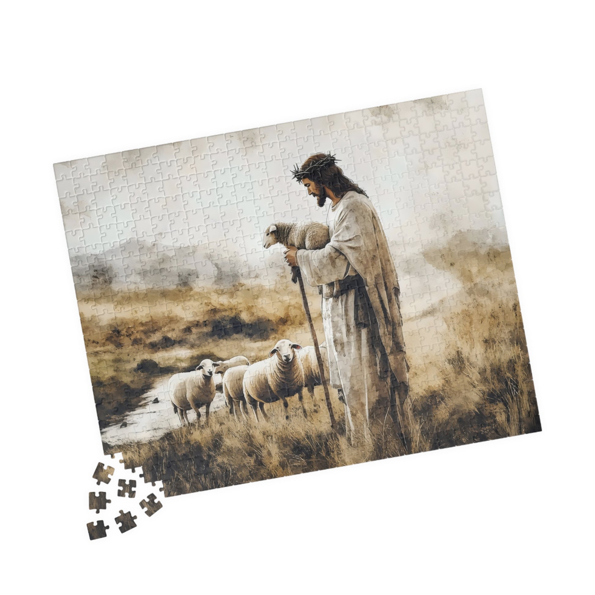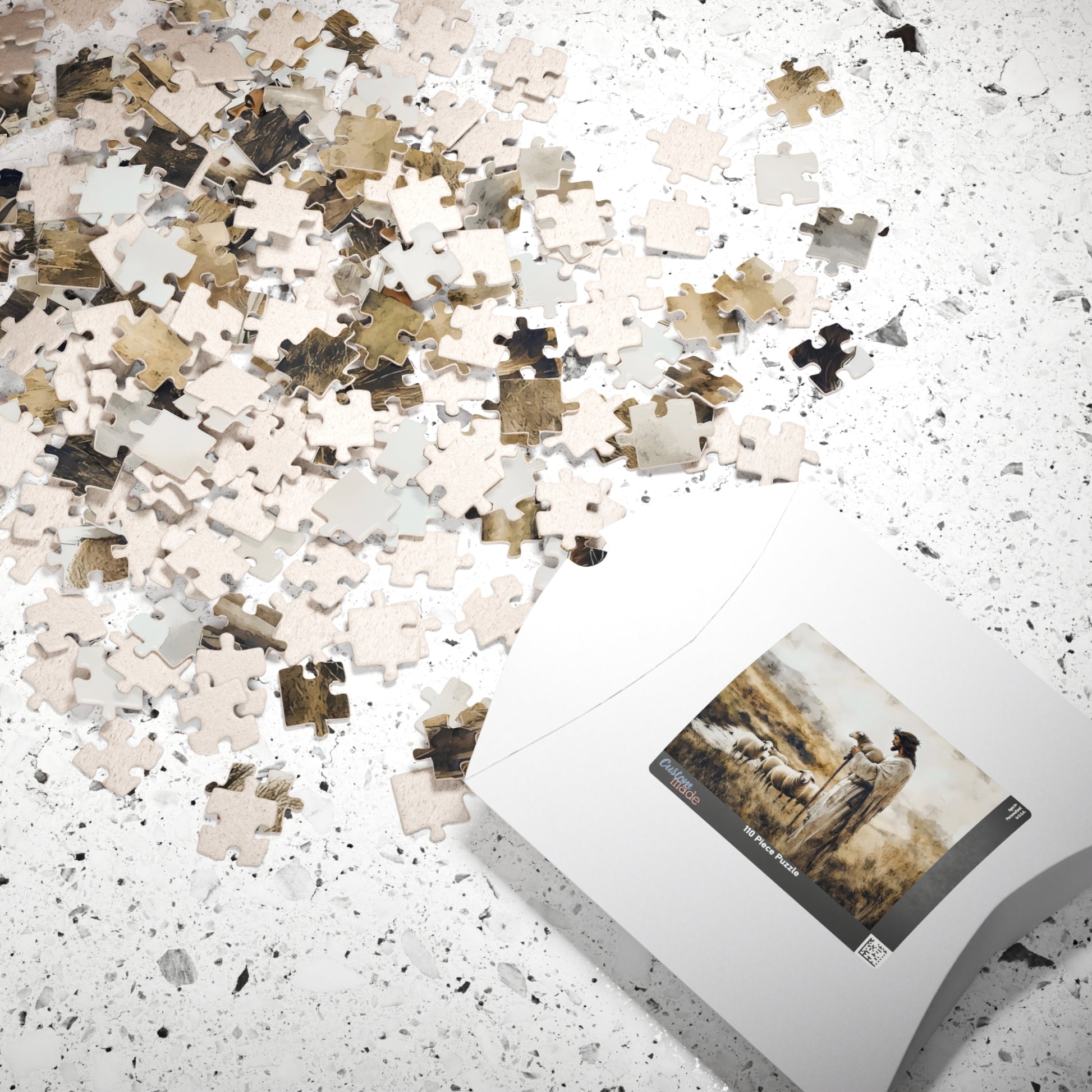 Soft light, quiet fields, and the low murmur of woolly companions — this puzzle brings a calm, contemplative scene into your hands. Each piece fits into a muted landscape where a lone shepherd tends his flock beside a misty stream. The colors are warm and slightly faded, lending a timeless, storybook quality that invites slow, focused assembly. Lay the pieces out on the table and let the scene unfold: gentle grasses, a weathered staff, the hush of early morning. It’s the kind of puzzle that pairs well with a cup of tea and an hour of uninterrupted peace, and it rewards patience with a comforting tableau that looks lovely displayed once complete.
