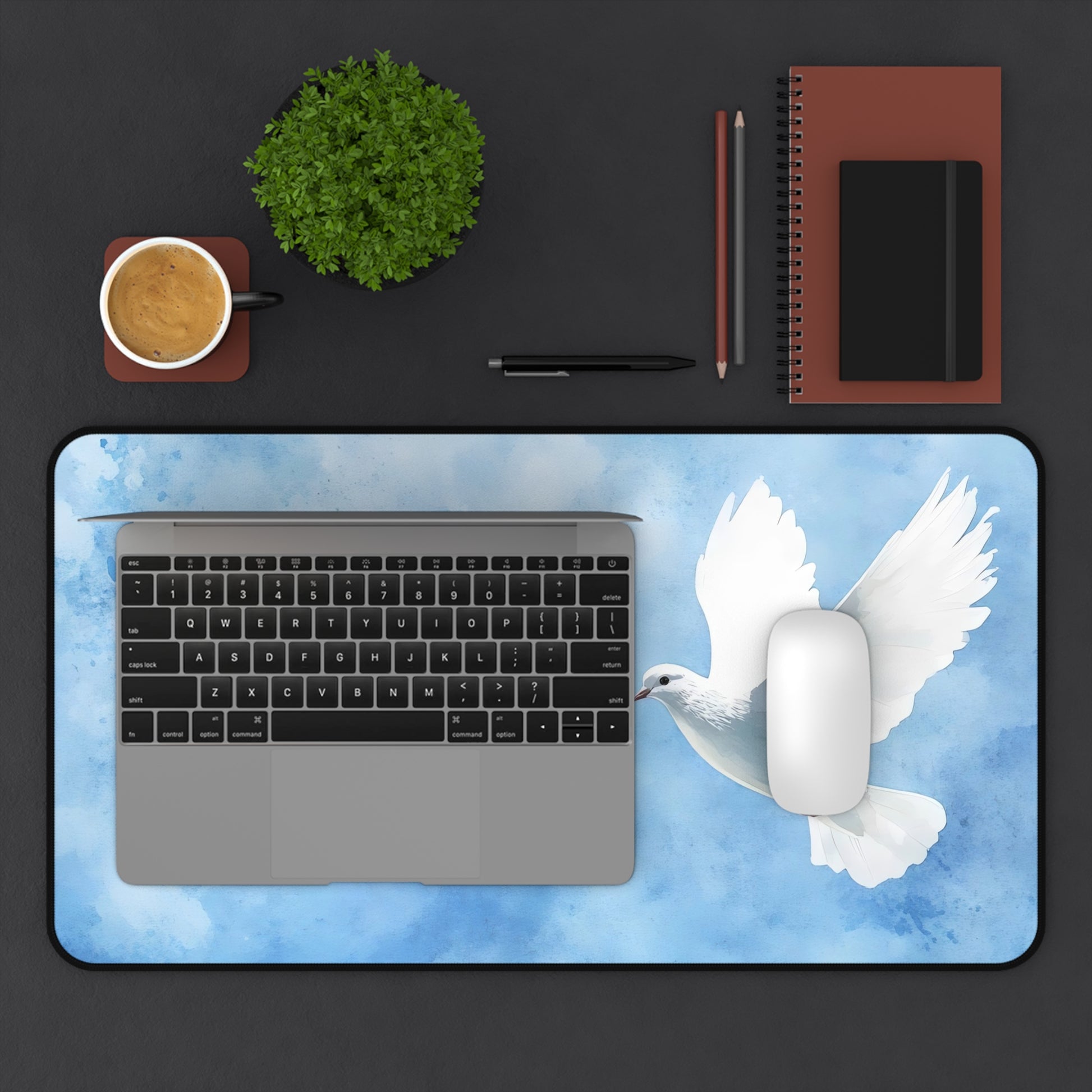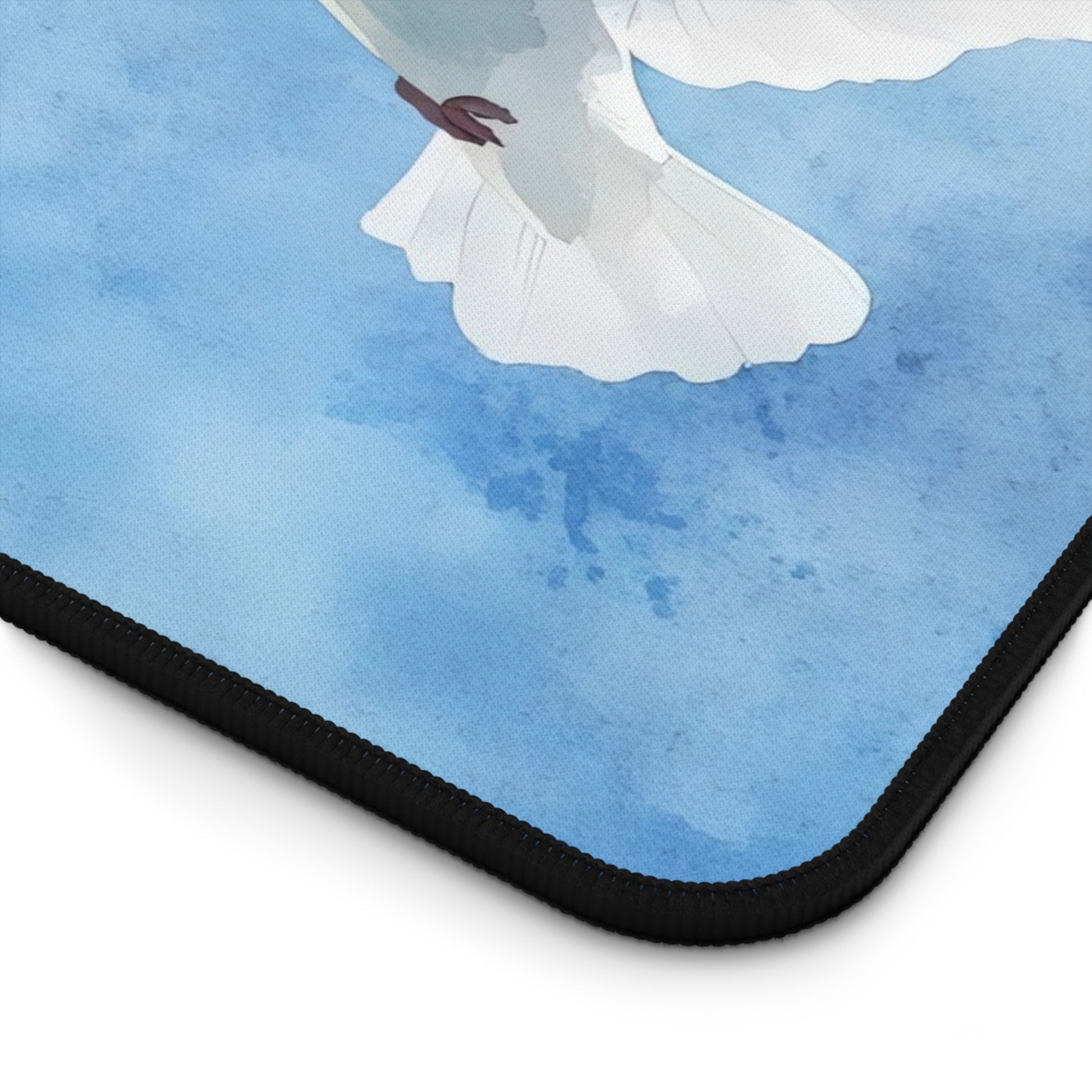Soft under your wrists, steady beneath your mouse — this neoprene desk mat brings a quiet, calming corner to any workspace. A gentle dove glides over a wash of watercolor sky, turning long hours at the desk into something a little more peaceful. The stitched edges hold up to everyday use while the textured, anti-slip base keeps the mat exactly where you place it. Sized for laptops, full keyboards, or craft projects, it’s a supportive surface that keeps tools steady and colors bright so the focus stays on your work, journaling, or morning coffee ritual.